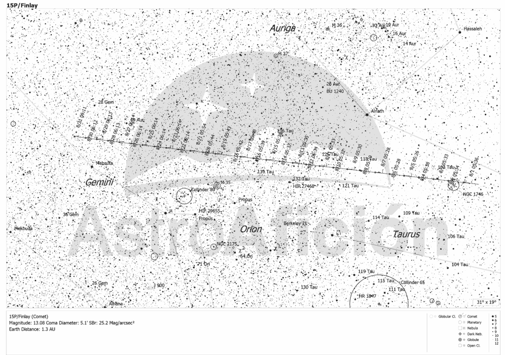 A falta de un candidato mejor durante este mes vamos a continuar con la propuesta del mes de julio; se trata del cometa 15P/Finlay, que durante este mes recorrerá la constelación de Tauro en las horas previas al amanecer.