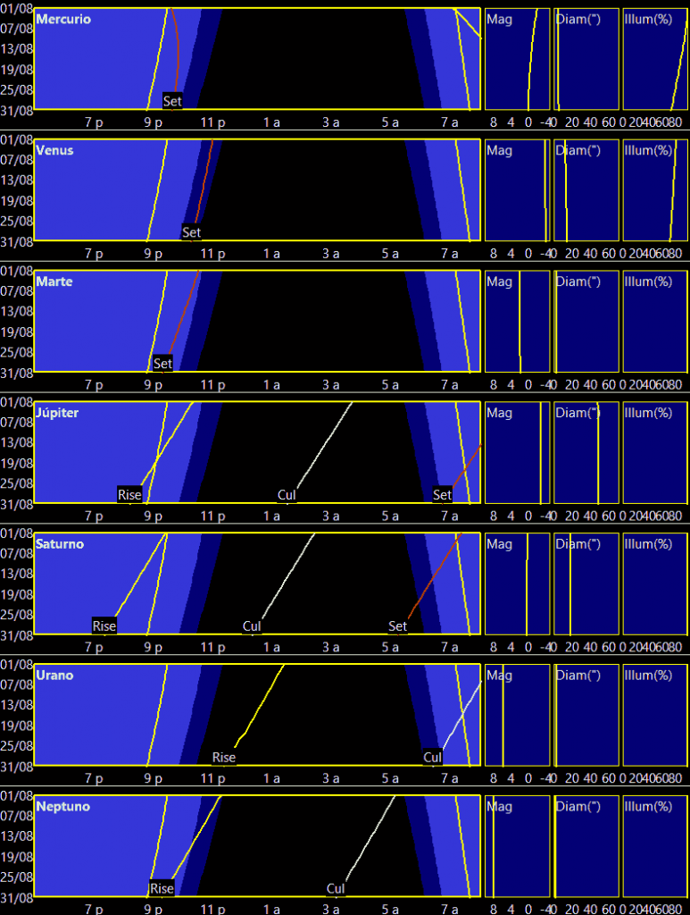 Durante este mes de agosto Júpiter será sin duda el planeta con mejores condiciones de visibilidad. Al atardecer ya estará presente en el cielo, donde permanecerá visible hasta que lo oculten las luces del amanecer. Alcanzará su máxima altura entorno a la medianoche. El día 20 Júpiter estará en oposición alcanzando su mínima distancia respecto a la Tierra. Durante este mes el planeta presentará el mayor tamaño angular de todo el año (49”).