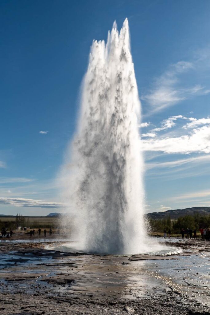 La zona geotermal de Geysir, y su espectacular géiser Strokkur (de más de 20 metros) que lanza columnas de agua caliente cada 5 minutos.
